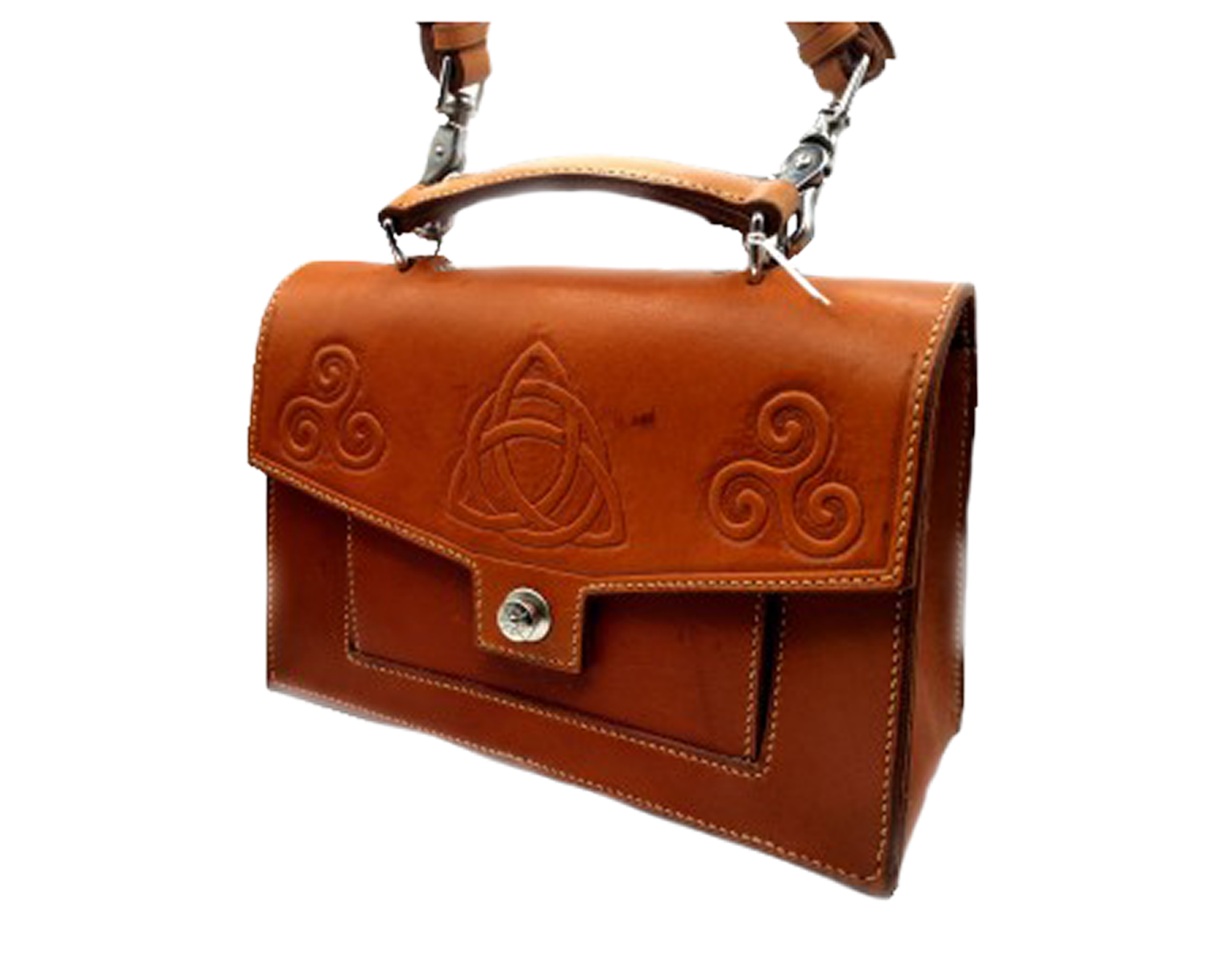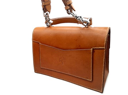 Sac en cuir de vachette pleine fleur tannage végétal origine France, Espagne ou Allemagne. Anse, poignée, poche arrière et avant. Motif cuir repoussé Extérieur : cuir naturel Boucle, rivet, fermeture loxx, mousqueton, en inox